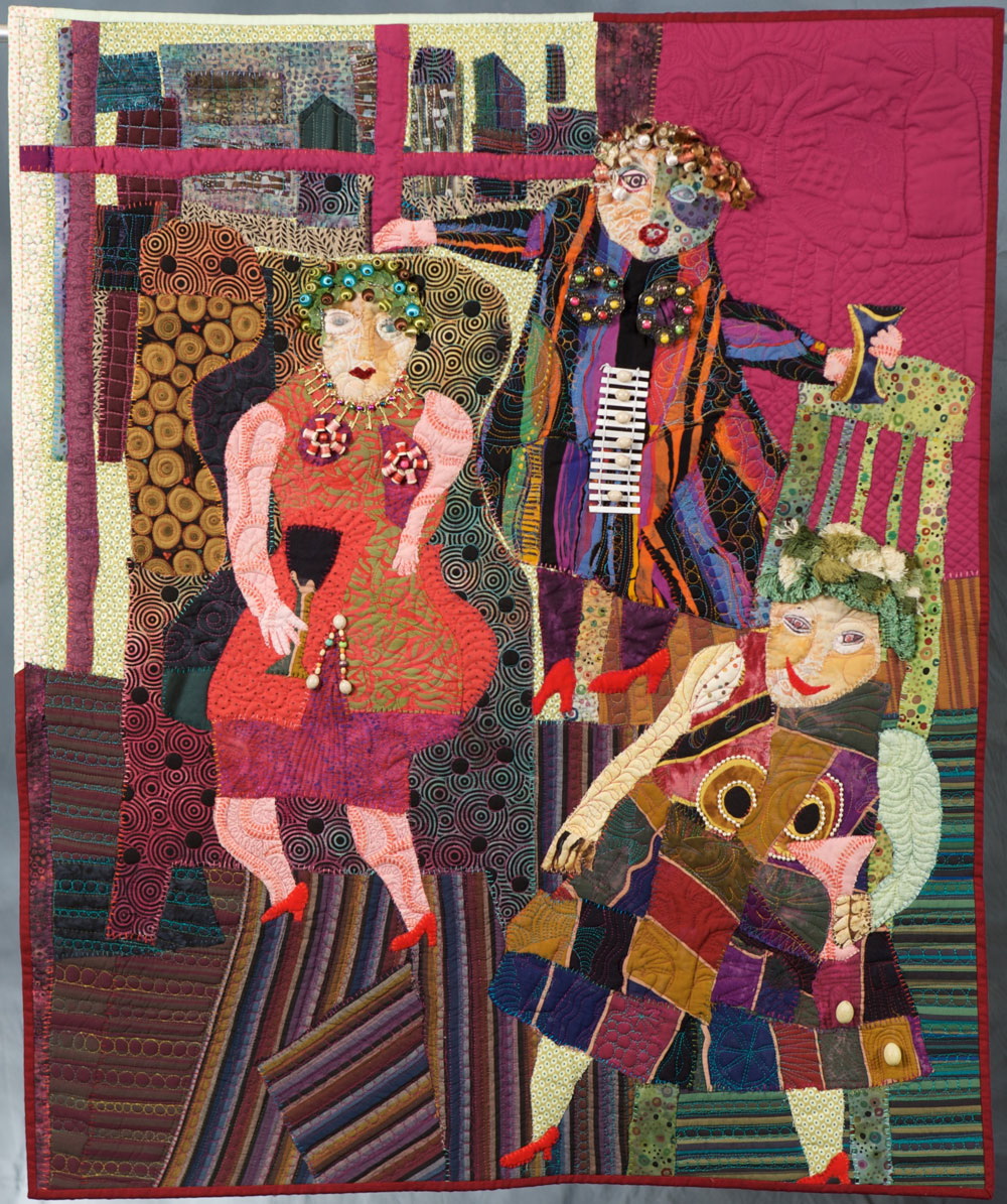 Мои любимые цвета, зеленое с коричневым. Коричневые, понятно, деревья, зеленое - трава. Отсюда и распределение по расположению: деревья вертикальные, трава по горизонтали. На большие квадраты взяла куски батиков, все разные (правда, мне потом сказали, что визуальных фактур слишком много, можно было взять рисунки поспокойнее). Для полосок отыскала в запасниках однотонные лоскутки. Сделала растяжку от темного внизу к более светлому вверху. Окантовку выполнила наборной полоской, чтобы поддержать пестроту фона.